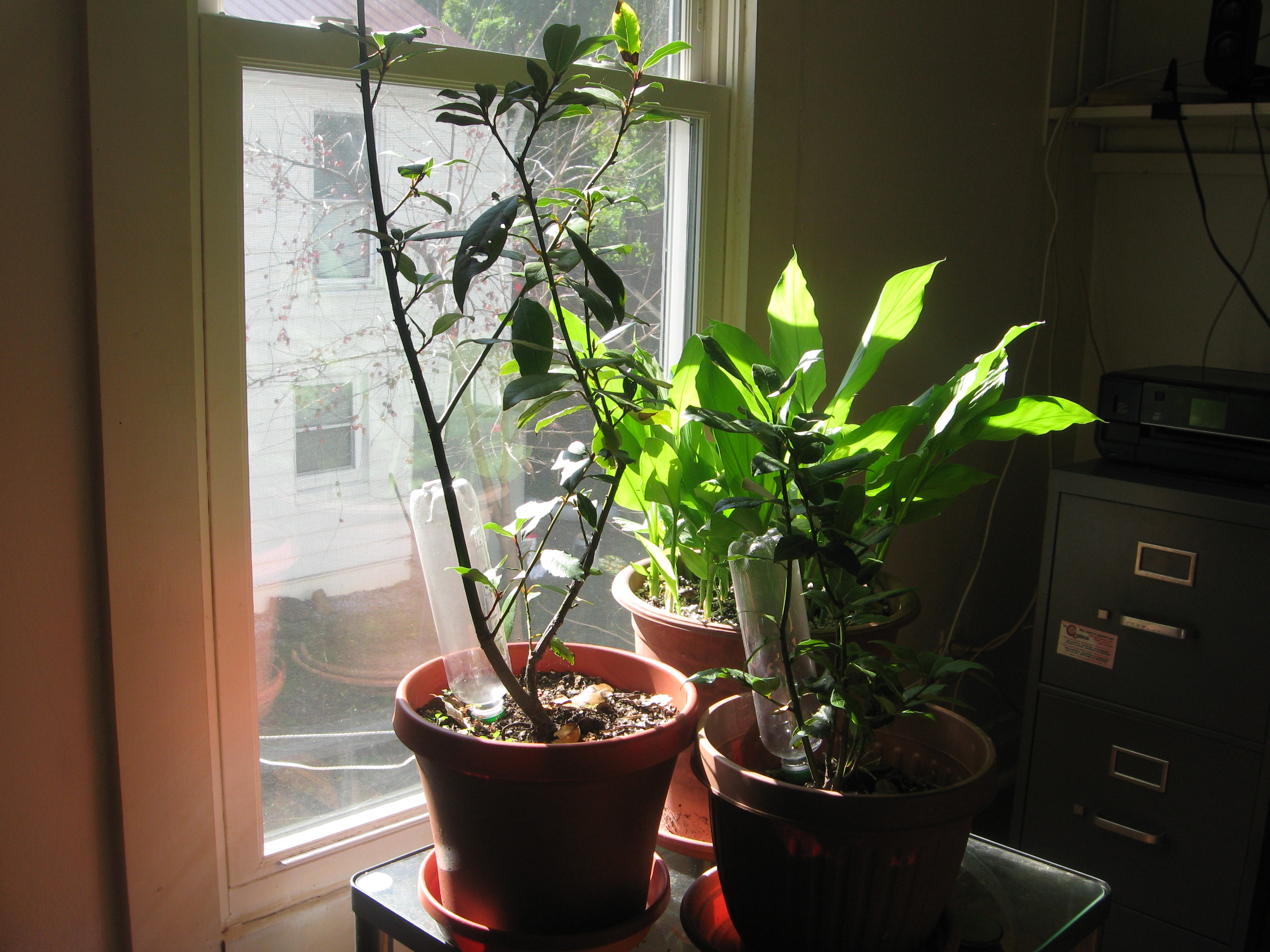 Since the weather has finally gotten cooler, my office is now home to my sweet bay (Laurus noblis) and the turmeric (Curcuma longa) plants. Frankie has not yet decided that they are munchies provided just for him. The culinary ginger (Zingiber officinale) has to take its chances on the deck since it’s much too large to bring inside.